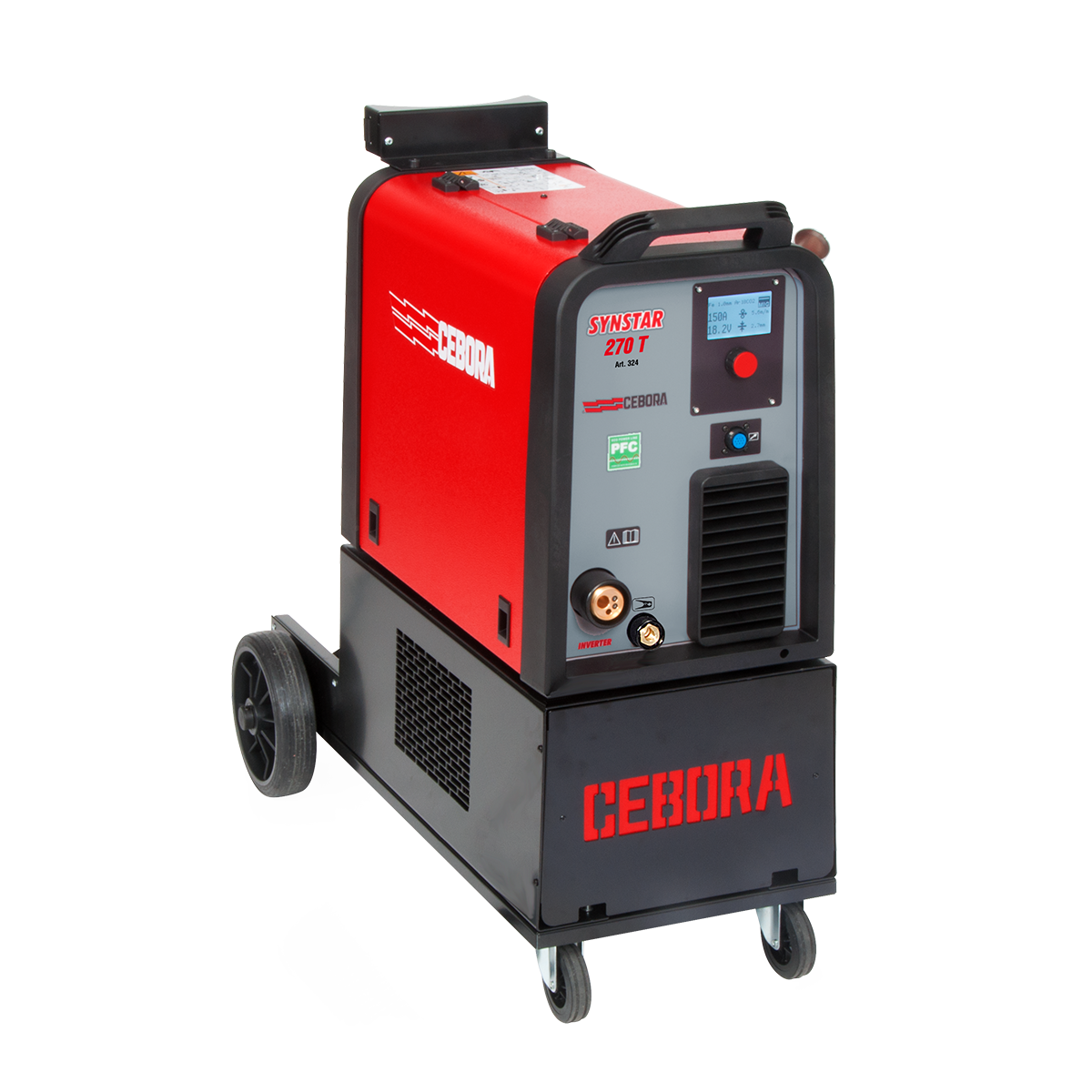 De MIG lasmachine is voorzien van een verrijdbaar onderstel, 4-rols draadaanvoermotor, euro connector, massakabel met klem en Cebora’s PFC module (Power Factor Correction) volgens de norm IEC/EN 61000-3-12. Dit zorgt voor minder stroomverbruik, hoger rendement, meer vermogen en hogere inschakelduur. Kortom: energiezuinige groene apparatuur!