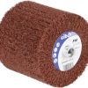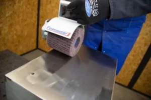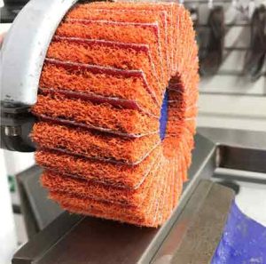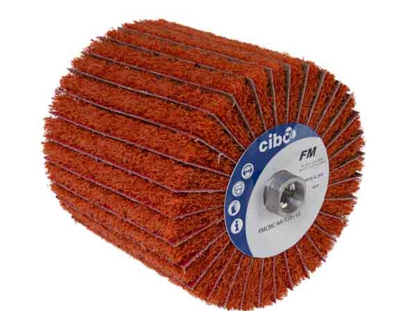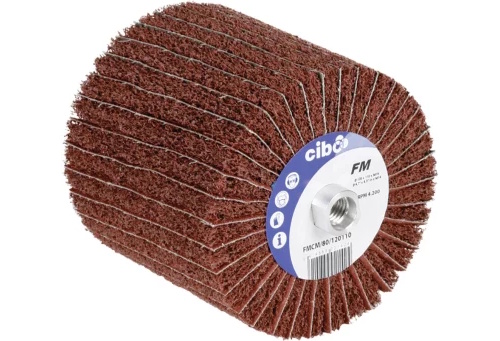 Voor een agressievere schuurwiel FMCMC (2e foto) van Cibo bestaat uit een combinatie van schuurvlies en schuurlinnen beide voorzien van keramische korrel. Het zachtere schuurvlies verzekert een zacht contact zonder veel vibraties. Ideaal om een uniforme lineaire geborstelde structuur te schuren. Het schuurlinnen zorgt voor een tikkeltje meer agressiviteit en laat toe om de laatste schuur fouten tof kleine bramen te verwijderen.