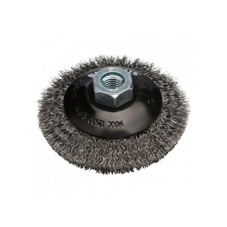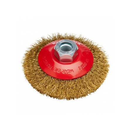 De Rhodius kegelborstel van staal met gegolfde staaldraad voor gebruik op haakse slijpers.