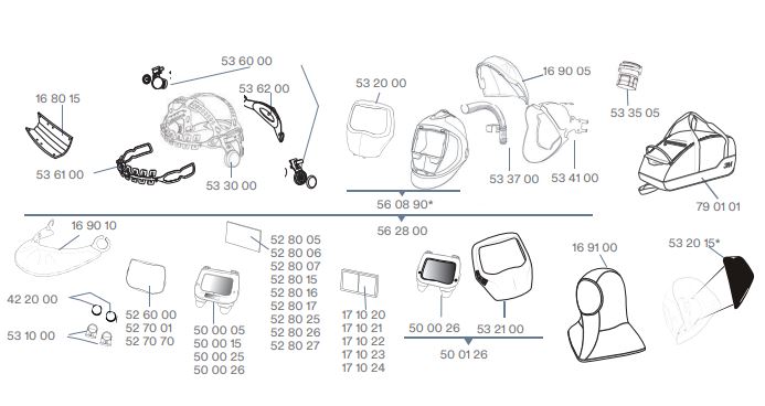 | 52 80 05 | Beschermruit binnenzijde 9100V verp. 5 stuks (117×50 mm) | 56 08 90* | 9100 Air Laskap zonder hoofdband, zonder luchtkanaal. zonder gezichtsafdichting, zonder ADF*** |